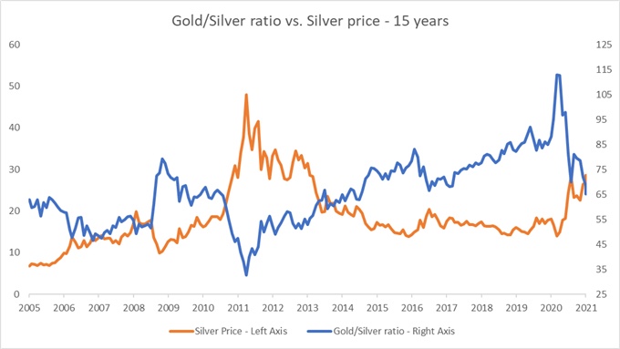• Gold/silver ratio is trading near a 15-year mean of 66, allowing plenty of leeway for silver to advance relative to gold