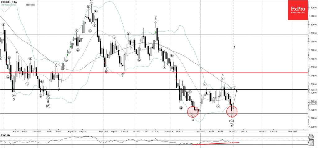 The breakout of the resistance level 1900.00 coincided with the breakout of the daily down channel from August – which accelerated the active impulse waves 3 and (3).